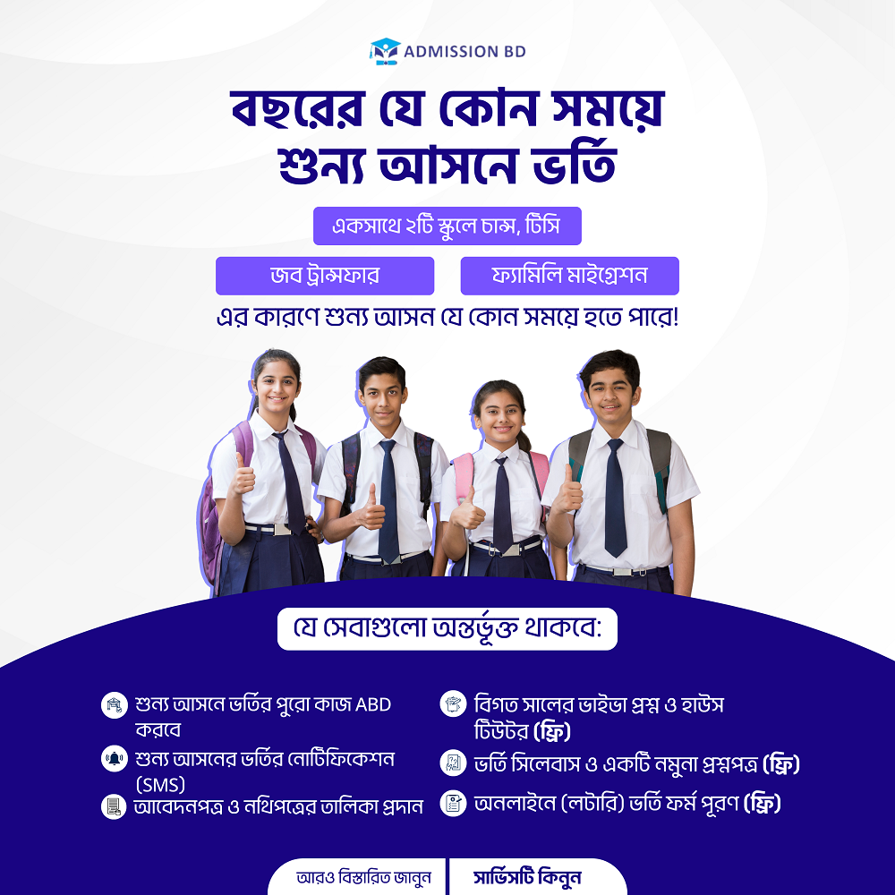 আপনার সন্তানের জন্য একটি সঠিক স্কুল নির্ধারণ থেকে শুরু করে, ভর্তি প্রিপারেশন, ফর্ম পূরণ, শুন্য আসনে ভর্তি কিংবা ভাইভার জন্য প্রস্তুতি এ সব কিছুর জন্য আপনি ভরসা রাখতে পারেন ADMISSION BD এর উপর।